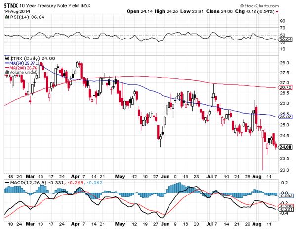 Treasury bonds spike to new one year highs, closing at a 2.40% yield, and trading as low as a 2.30% yield in the overnight market at one point last week. Clearly, serious deflation is continuing for the indefinite future.