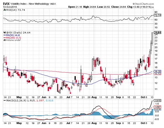 8) Volatility spikes (VIX) also signal market bottoms (see chart below). We are nearing another top with the closely followed indicator closing at $24.64 today, a high for the past two years.