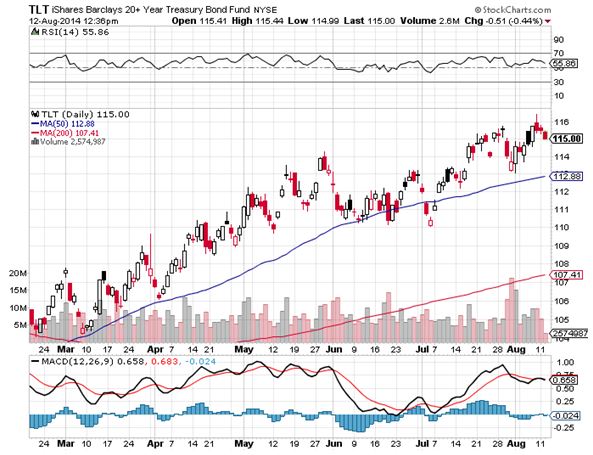 As long as the iShares Barclay 20+ Year Treasury Bond Fund (TLT) closes at $115.00 or below on Friday, you will achieve the maximum profit in both these positions. Today, the (TLT) closed at $114.76, so, so far, so good.