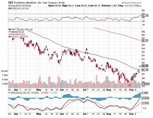 This has been a fantastic week for bond bears. The (TBT) has rocketed from $54.00 to $59, a nearly 10% move. Yields on the ten-year Treasury bond have soared from 2.32% to 2.60%.