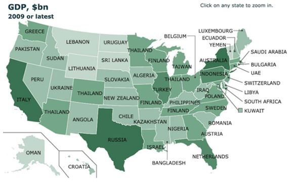 At least these would be my conclusions after looking at a map prepared by my esteemed former employer, The Economist magazine, of the United States, renaming each state with it's international equivalent in GDP.