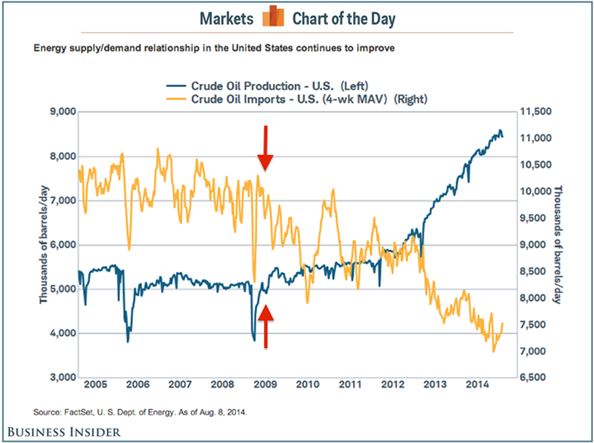The message is pretty clear. In the last five years, US oil production has skyrocketed from 8 million to 11.3 million barrels a day. America is now the world?s largest oil producer, eclipsing Saudi Arabia at 11 million b/d, and Russia at 10.5 b/d and falling.
