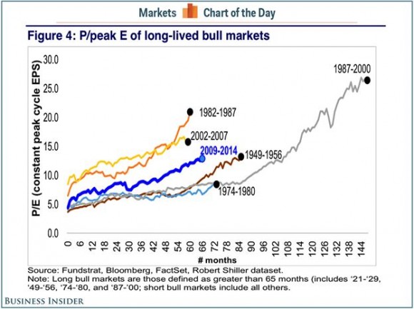 The chart tracks long-lived bull markets in terms of their price earnings multiples. It shows that we have only reached half the length of the great 1987-2000 bull market. The implication is that this bull could live another five or more years.