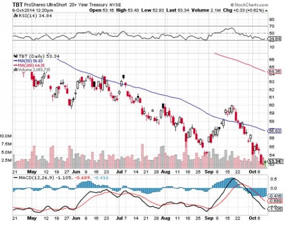 If you can?t do the options, this is a great entry point for the ProShares Ultra Short Treasury 20+ ETF (TBT) at $53.34.