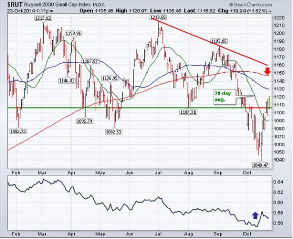 6) The small cap index, the Russell 2000 (IWM), starts to outperform the S&P 500 (SPY) on the upside. Smaller companies led the retreat on the downside, and should lead a new recovery as traders like me cover shorts (I already have).