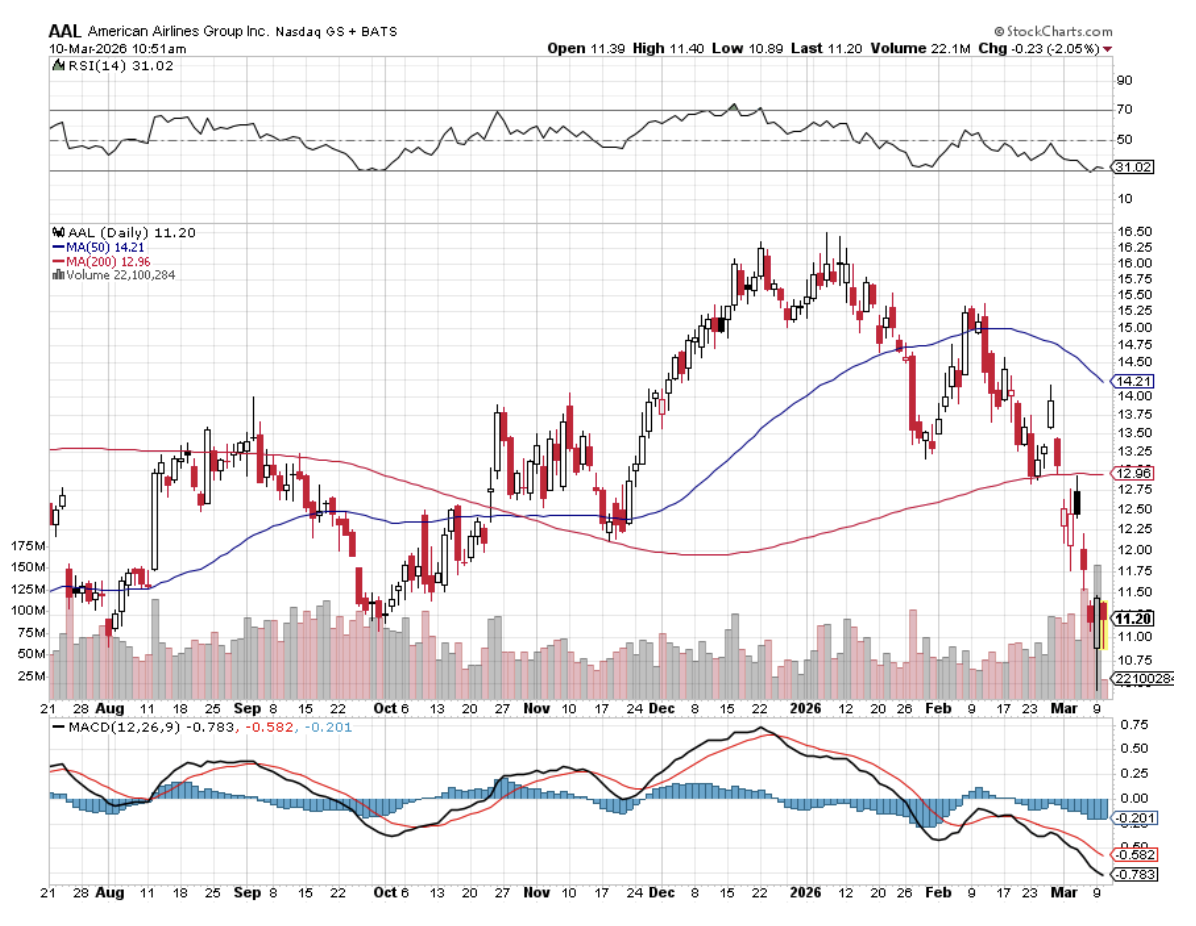 the most exposed airline to rising fuel prices. American Airlines is attractively priced at 0.2 times price to sales, with analysts projecting over 60% upside. Robust premium and corporate travel demand, coupled with debt reduction below $35 billion in 2026, supports American Airlines. American Airlines projects 2026 earnings between $1.70 and $2.70 per share, with 2027 EPS growth of nearly 30%.