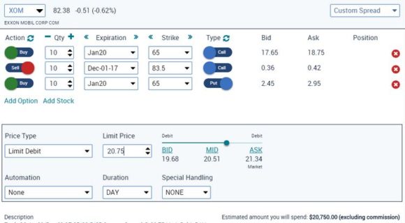 Here's the new Exxon (XOM) long call diagonal with protective put: