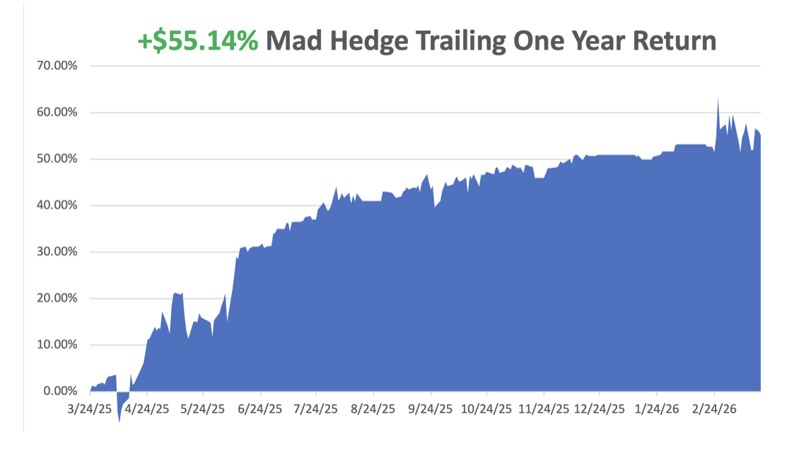 Today, the Diary of a Mad Hedge Fund Trader and its Global Trading Dispatch are read in over 140 countries by 30,000 followers. The Mad Hedge Technology Letter, the Mad Hedge Biotech & Health Care Letter, Mad Hedge AI, and Jacquie’s Post also have their own substantial followings. And the daily Mad Hedge Hot Tips is one of the most widely read publications in the financial industry.