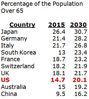 For example, in China, the number of working age adults per senior plunges from 6 in 2020, to 4.2 in 2030, to only 2.6 by 2050!