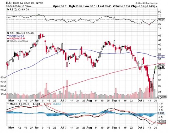 Delta Airlines (DAL) has just seen its cost of fuel, its largest single expense, drop by 25%. What has the stock done? Fallen 30%, mostly thanks to the Ebola virus.
