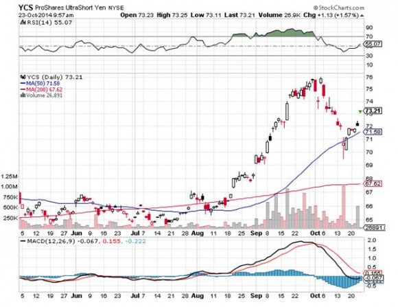 So I am going to jump in here with a bet that the yen is going down by strapping on a Currency Shares Japanese Yen Trust (FXY) November, 2014 $92-$95 in-the-money vertical bear put spread.