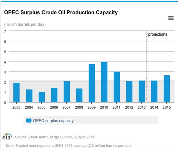 Oil imports have collapsed from 10.3 to 7 million barrels a day. The share coming from the volatile Middle East has shrunk to a miniscule 2 million barrels a day. Some 80% of Persian Gulf oil exports now go to China. OPEC surplus oil production capacity is soaring (see table below). It couldn?t happen to a nicer bunch of people.